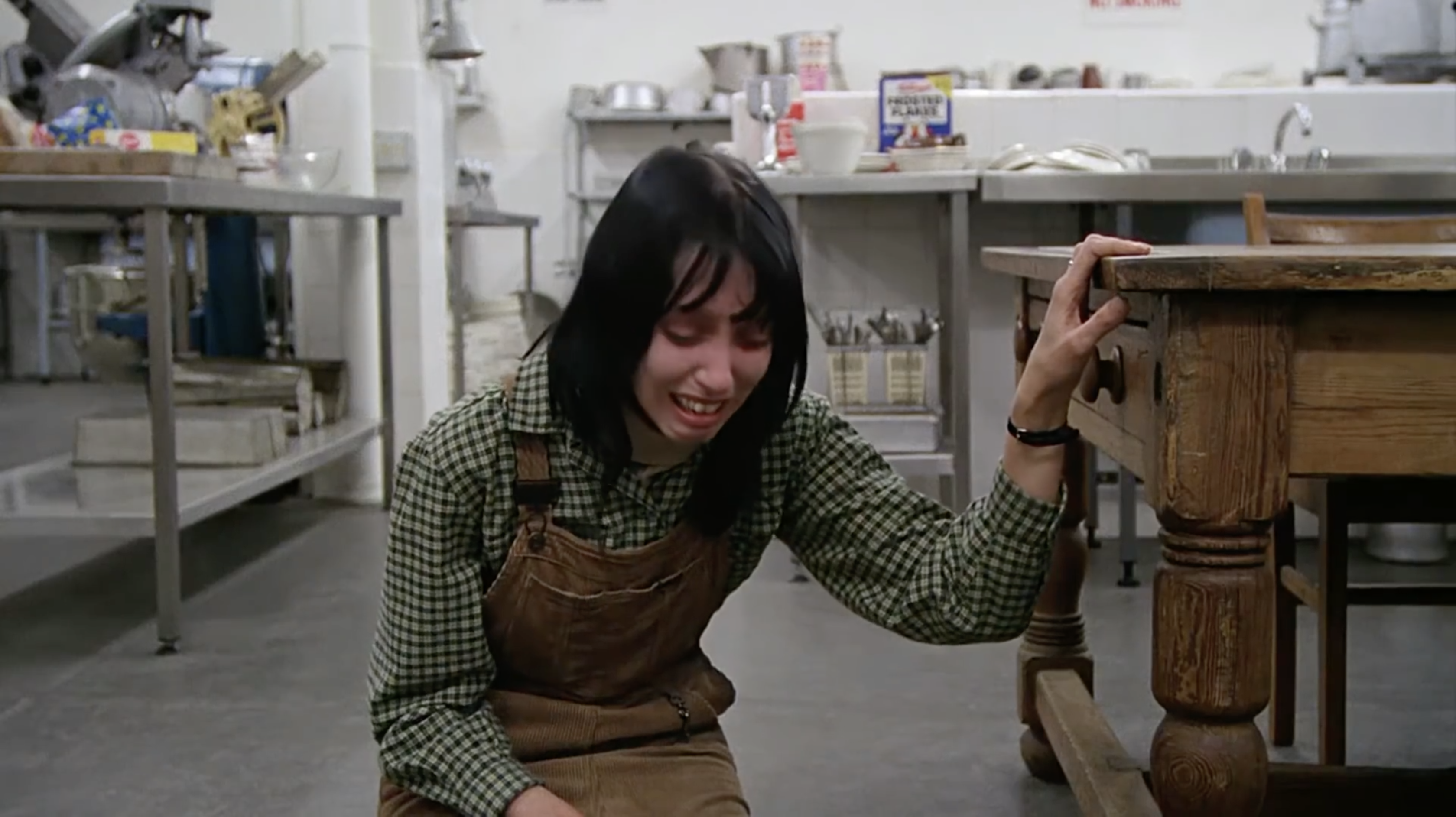 This comes to a head when Wendy discovers Jack’s manuscript is nothing but the phrase “All Work And No Play Makes Jack A Dull Boy” written over and over. Jack confronts her about what should be done about Danny—a conversation we’re informed that Danny can hear. This encounter, full of repeated phrases (and filmed a record 127 takes on set), is where Jack threatens to bash Wendy’s brains in. She responds by striking Jack with a baseball bat, first on his hand, and then his skull. Up until this confrontation, Wendy has perpetuated the internal dynamic within the family, earlier justifying Tony’s existence to the doctor and Jack’s abusive behavior. Now she is unable to kill Jack, despite the plain threat he represents to her and Danny. Instead, he is locked in the kitchen storage (story) room.