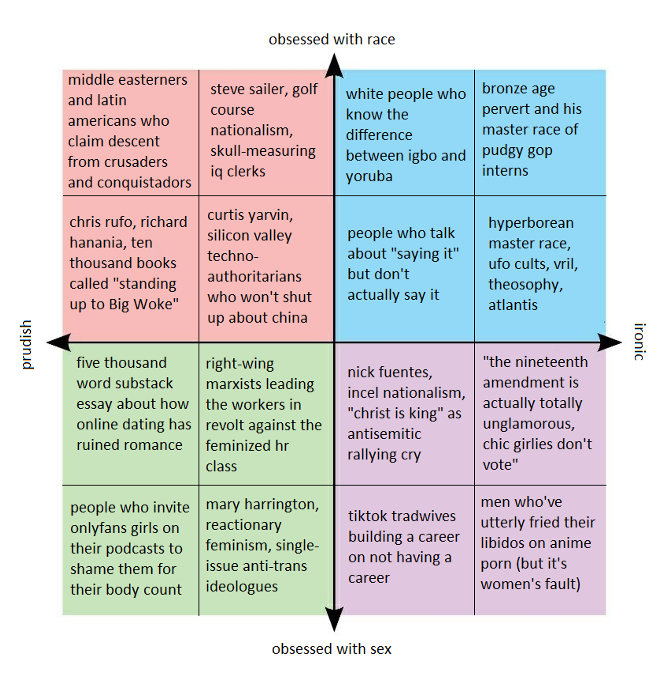 It doesn’t help that the divisions within the online Right don’t easily map on to any clear left-right axis. One major split emerged in 2022, when Curtis Yarvin, whom we've already met, tried to dissuade the Right from focusing on culture-war issues, abortion, or critical race theory in schools. These, he wrote, were issues for “hobbits,” dumb red-state bumpkins locked in a losing struggle against liberal metropolitan “elves.” As the internet's foremost monarchist, Yarvin has a generally low opinion of the broad mass of the people: he’s not impressed by the small victories of the hobbits in the War on Woke; his preferred path is a cultural palace coup by “dark elves”—that is, urban intellectual elites who are secretly “on the hobbits’ side.” In other words, instead of trying to ban abortion, the unwashed masses should just sit back and let Yarvin and his fellow far-right Gramscians do the important political work of rambling to cigarette-smoking models at Manhattan parties. This stance has made Yarvin an enemy of the Right's more populist currents, but it’s hard to say exactly who gets the benefits of NETTR. Is it more right-wing to have disdain for the masses? Is it more right-wing to hate the degenerate elites? Who is to the right of whom?